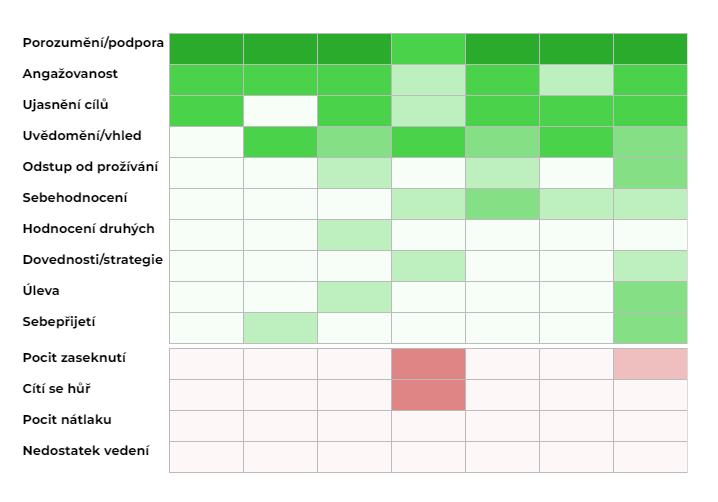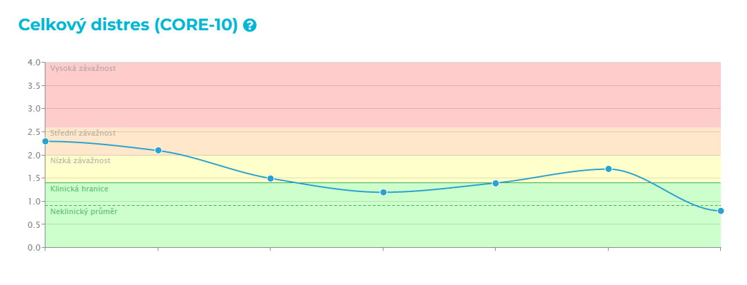 V průběhu terapie pak klient před sezením vyplňuje krátký dotazník mapující jeho postupný pokrok (zde měříme jak celkový distres, tak i duševní pohodu - tedy pozitivní i negativní ukazatel klientova fungování). Po sezení pak vyplňuje otázky týkající se jeho vnímání terapeutického procesu (tj. jak vnímal proběhlé sezení a co si z něj odnáší). Tyto informace pomohou terapeutovi sledovat pokroky klienta a upozorní ho v případě, kdy terapie nepostupuje podle očekávání.